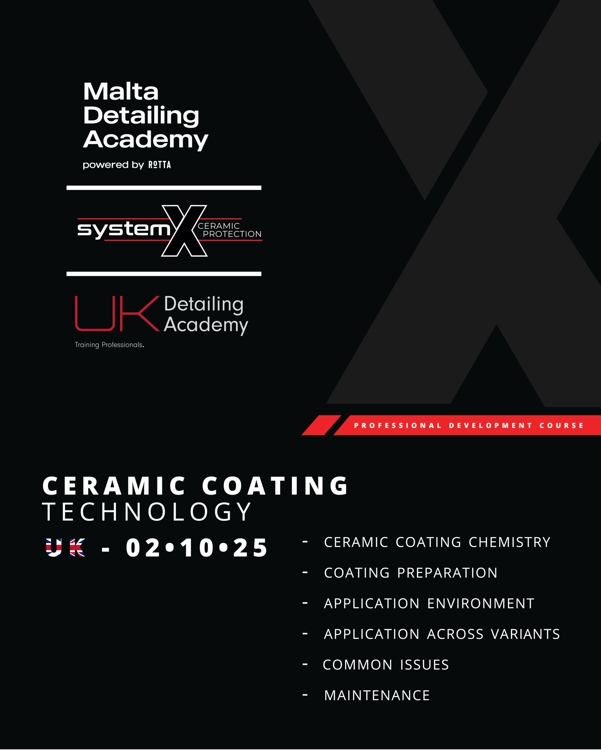Please note that the price listed is solely for the training programme and does not include flights, accommodation, or transportation. All travel-related arrangements and expenses are the sole responsibility of the candidate. Malta Detailing Academy (MDA) is not liable for any costs incurred in relation to travel, accommodation, or transport before, during, or after the training programme.